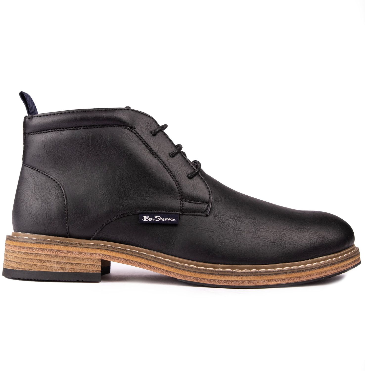 Cutting a sleek silhouette, the Toby ankle boots from Ben Sherman are sure to smarten up your style. The black chukka boots boast a leather-look upper, cushioned ankle cuff, branding on the side and are finished with a textured outsole for added grip.