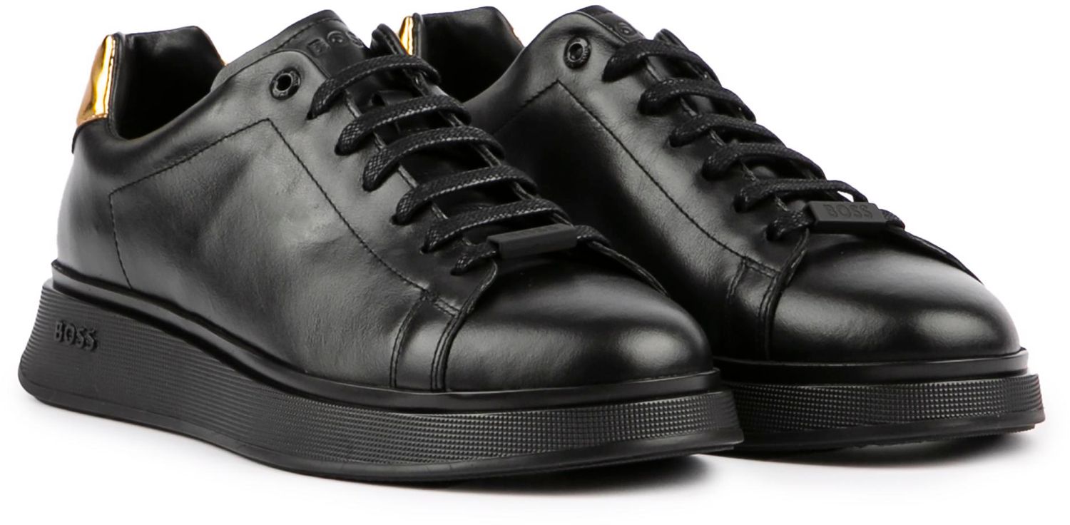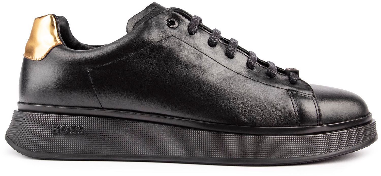 Men's black Boss Bulton Runn lace-up trainers with smooth leather upper featuring branded lace anchor. metal top eyelet. and embossed branded logo to tongue and heel. These monochrome sneakers have a branded footbed. and chunky white branded rubber sole.