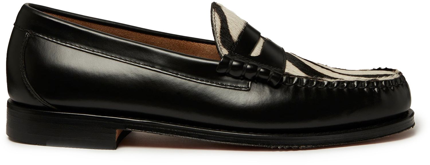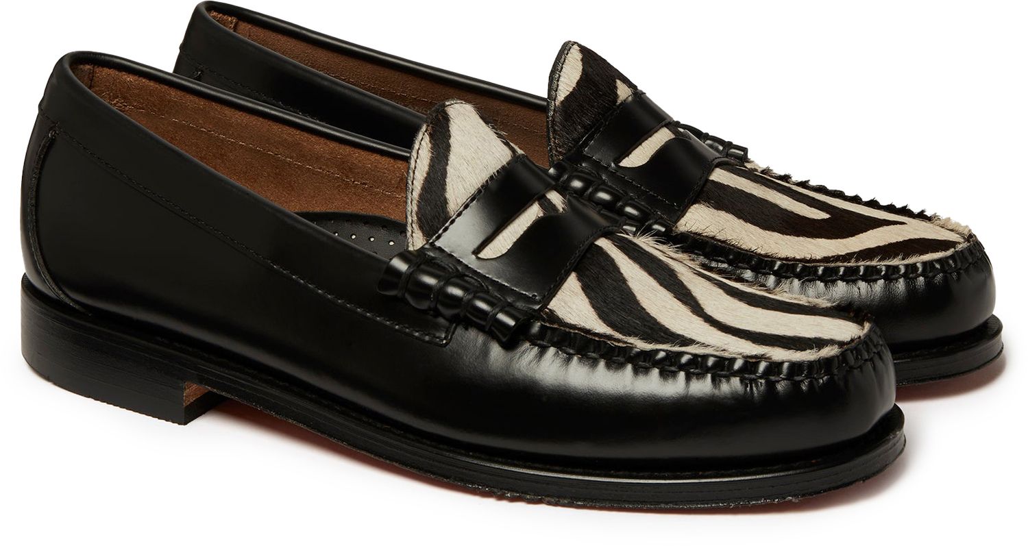 the original loafer returns with a statement zebra print hairy apron for a textured finish that elevates the classic penny design. Handcrafted from black polished leather with the quality Weejuns tubular moccasin construction, this subtly statement shoe is set on a slim leather sole for easy elegance; match yours with occasion wear or turned up trousers and a leather jacket for versatile dressing.