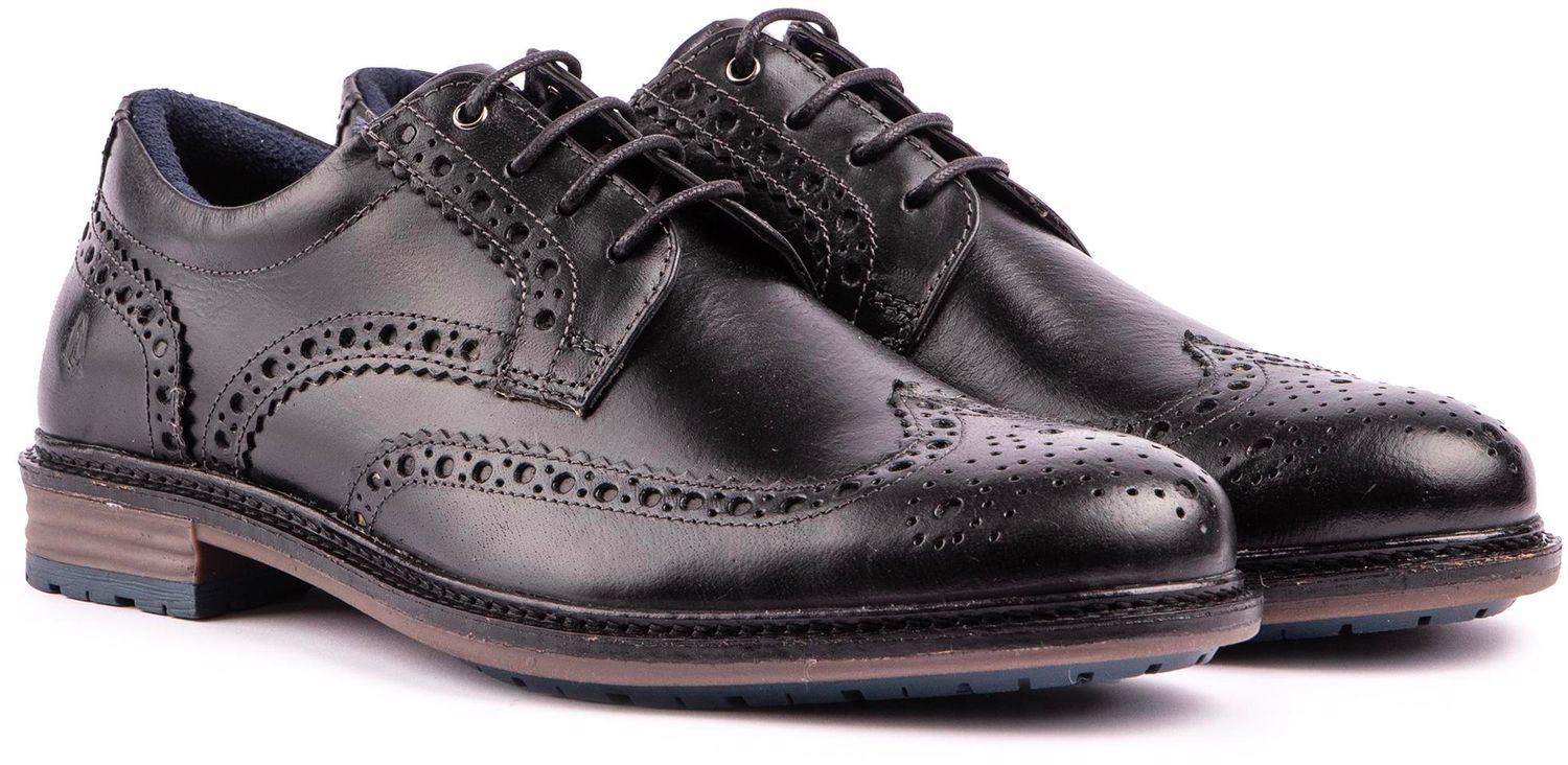 A modern Brogue shoe with a kick. The Largo men's shoes from Hush Puppies are made from smooth leather. with ornate brogue detailing. a cushioned innersole and a gripping outsole. They are your ideal choice for urban encounters. office wear and evenings out.