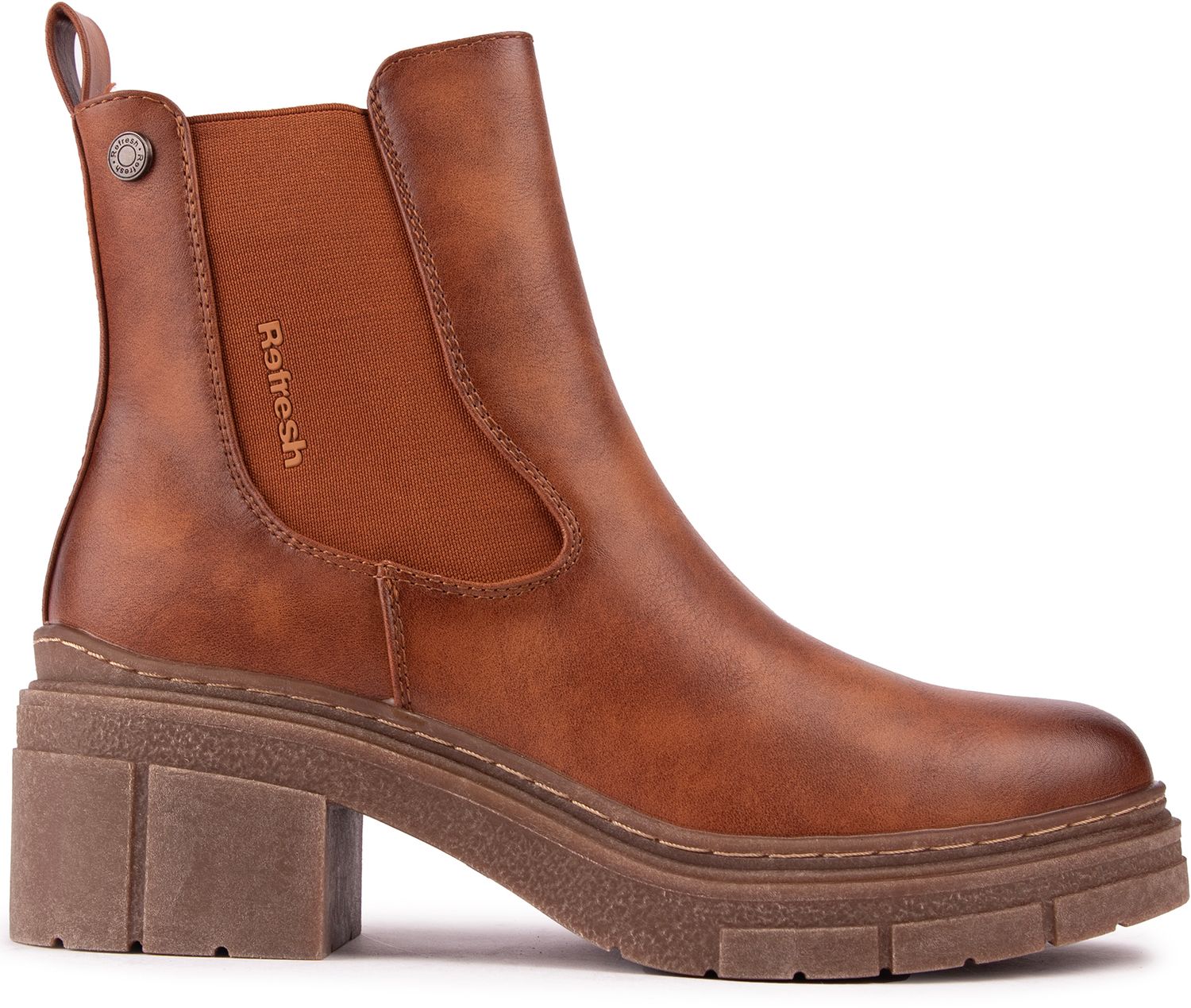A stylish, confident and feminine way of welcoming the changing seasons, the Refresh Gusset Chelsea boots are an ideal pair for your urban adventures. The tan women's boots have an inside zip with a branded zip pull, a chunky, cleated outsole with a 5cm heel and a metal button branding. A refined boot for those who take the high road.